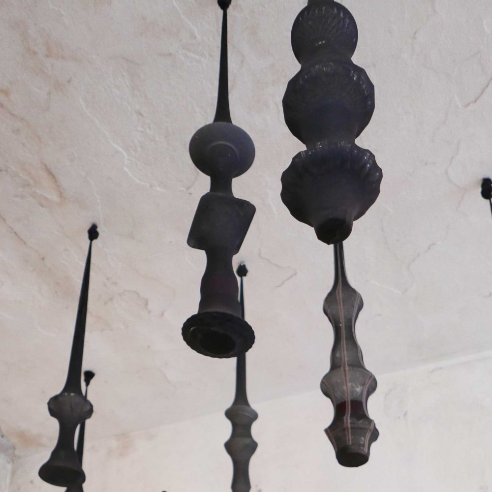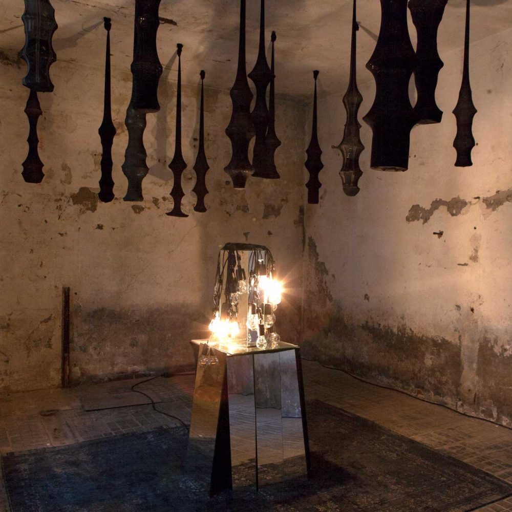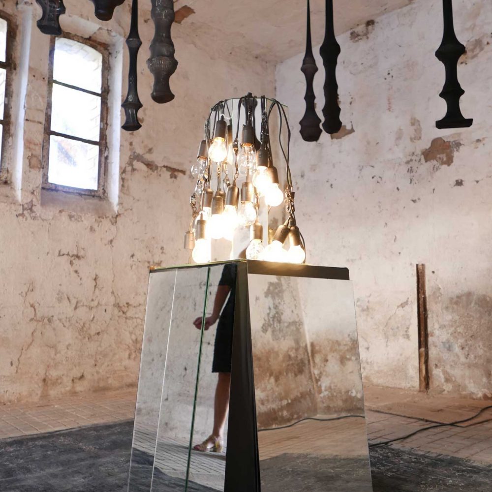 Die schwarzen Lampenfassungen hängen über einem Gebilde aus unterschiedlichen Spiegeln. Durch die mehrfachen Spiegelungen entsteht eine Tiefenwirkung, die den Blick in eine Art Gegenraum frei gibt. Die Wahrnehmung wird erweitert, sie ermöglicht den Dialog mit sich selbst. Der Raum wird zu einem poetischen Ort des Abtastens und der Suche, der zum Nachdenken über das Wechselverhältnis zwischen dem Individuum und seinem familiären Umfeld einlädt.
